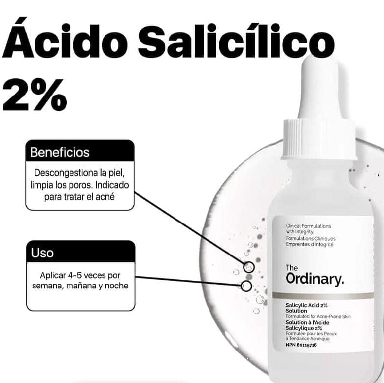 El ácido salicílico es un beta-hidroxiácido que penetra profundamente en los poros y ayuda a eliminar las células muertas y el exceso de sebo.